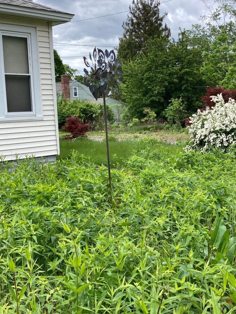 “The first thing I did was to visit a local native plant nursery (Nasami Farm in Whately, MA) where I was impressed with their pollinator garden kits, so I decided to start small and bought two kits (a total of 100 plugs with a mix of native flowers and grasses) to plant between the few (non-native) shrubs and flowering trees I’d planted during my first couple of springs in this house as a privacy screen between my deck and the street. I bordered that area with granite bricks as edging and was hoping the pollinator-friendly plants would become an effective ground cover. In addition to the love of wildflowers, my mom had also taught me to experiment in the garden, and she modeled for me that any and all plants can be moved around, sometimes over and over again until you find just the right place for them. So I was confident that this experiment would be something I could play around with in the future, and I planted the plugs in clusters through the area in hopes of creating waves of color beneath the branches. It worked! The remaining side “lawn”–and I’m using that term very loosely–was now much smaller (approximately 20’ x 44’ of green remained, with a mulch pad around the base of a bridal veil spirea on one edge and a narrow mulch path on the house side), and it was still a nightmare to mow. I used to tell friends it was a “broken ankle waiting to happen” because my little battery powered mower was especially hard to push around on the uneven, weed-filled ground. So, mowing that section, with a sidewalk on the short end and a gravel street edge on the long side, felt more like an obstacle course than anything. I knew something had to change; I just didn’t know what that change might be yet. And this side area got the best sun in the entire yard, so it seemed a shame to waste it on grass, especially not-so-nice grass.” (Image below is from 2020, the first spring with my pollinator garden inside the circle of stones and with the side yard in the background, still just grass)